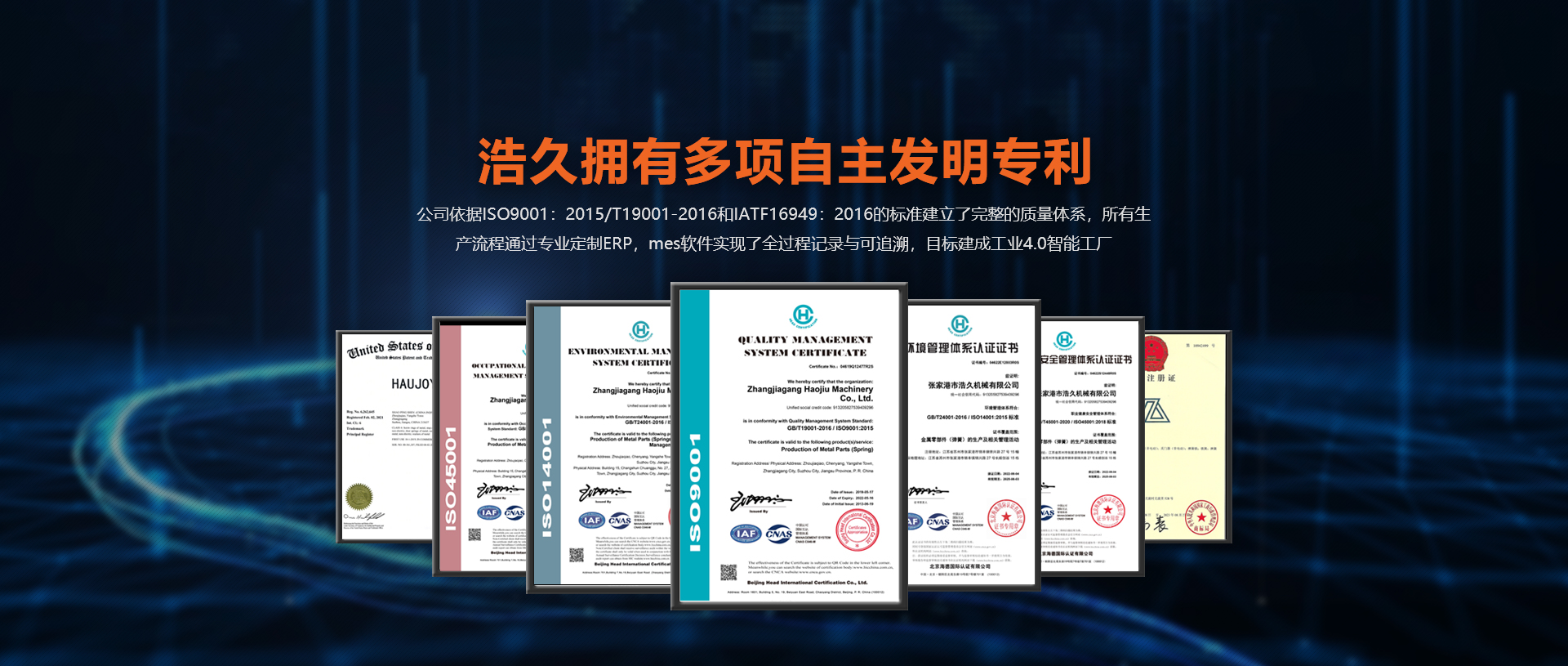 浩久擁有多項自主發(fā)明專利。公司依據ISO9001GB/T19001-2016和IATF:2016的標準建立了完整的質量體系,所有生產流程通過專業(yè)定制ERP,mes軟件實現(xiàn)了全過程記錄與可追溯,目標建成工業(yè)4.0智能工廠。